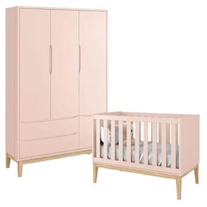 Berço Americano e Guarda Roupa Classic 3 Portas Rosa com Pés Madeira Natural - Reller