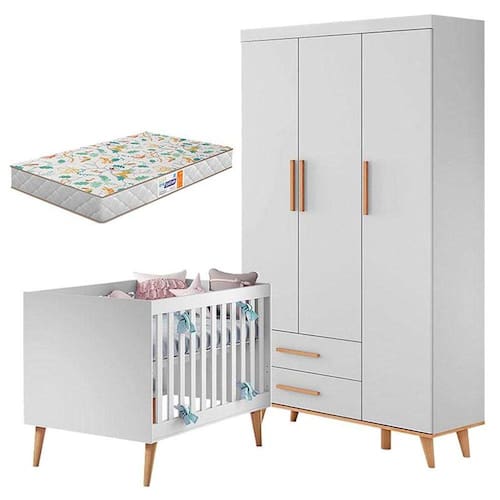 Berço Americano e Guarda Roupa Infantil Ludmila Branco Bétula com Colchão Gazin – Carolina