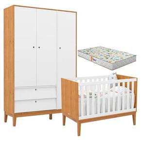 Berço Americano e Guarda Roupa Unique 3 Portas Freijó Branco Soft Eco Wood com Colchão Gazin - Matic