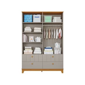 Fabricado em MDF , com 04 portas com slow motion ,puxadoresem madeira , gavetas com corrediças telescópicas, detalhes em baixo relevo;