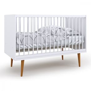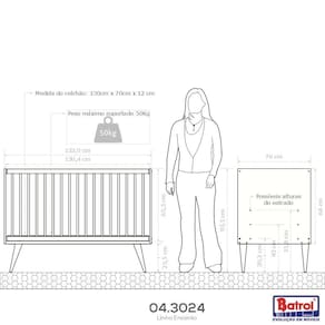Características: - Produto em: MDP de 15 e 25 mm e MDF de 6 mm - Indicado para colchões: 70x130 cm -não incluso- - Não acompanha suporte para mosquiteiro - 04 pés formato cônico em madeira de 25 mm - Acabamento pintura: Brilho - Suporte de peso 50 kg - Grade fixa - Possui 3 posições de estrado - Garantia de 12 meses