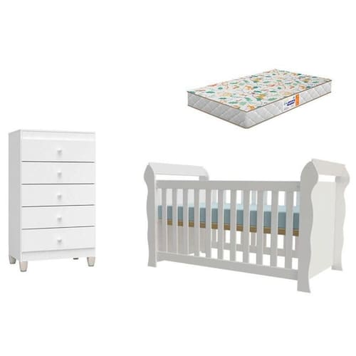 Berço Americano Lara com Colchão Gazin e Cômoda Gaveteiro Ternura Baby Branco Brilho Incorplac