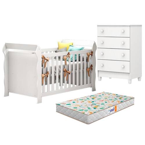 Berço Americano Lara e Cômoda Gaveteiro Mel Flat Branco Brilho com Colchão Gazin – Carolina