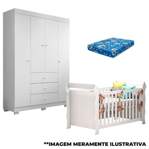 A mamãe começou a montar o quartinho do seu filho? Apresentamos para você este belo conjunto composto pelo berço americano da linha Lara fabricado pela Carolina acompanhado do colchão para berço americano e o guarda roupa 4 portas da linha Duda fabricado pela Phoenix Baby. O berço possui a função mini cama que acompanha o crescimento do seu bebê, aproveitando por mais tempo o berço. Já o guarda roupa conta com quatro portas e três gavetas, ideal para a mamãe guardar as roupinhas e acessórios. Mantendo ambiente organizado e livre de bagunças. Desenvolvidos em MDP/ MDF de qualidade, garante mais durabilidade e resistência. Esse conjunto foi cuidadosamente projetado para acompanhar todas as fases de crescimento do seu filho, além de trazer mais sofisticação ao ambiente. Confira as características: