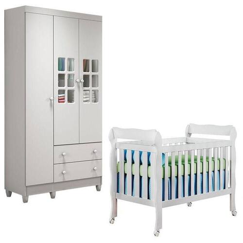 Berço Americano Lila e Guarda Roupa Mariah 3 Portas Branco Brilho Carolina