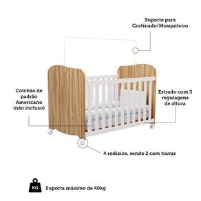 Características: Produzido em MDF Berço Padrão Americano Tamanho do Colchão Indicado: -L x C- 70cm x 130cm Acabamento: Pintura U.V. Pintura Atóxica: Sim Bordas arredondadas e Laqueadas Peso que suporta: 40Kg Acompanha Suporte para Mosquiteiro: Sim Base do Colchão com 3 opções de altura: 16,1cm / 32,1cm / 44,9cm Material das Grades: MDF Rodízios: 4 rodízios sendo 2 com travas Certificado Pelo Inmetro: 001950/2019