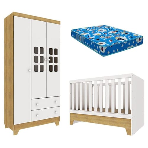 Está montando o quarto do seu filho? Apresentamos para você este belo conjunto composto pelo Berço e Guarda Roupa da linha Malu, este conjunto foi projetado para ter total conforto, praticidade e estilo. O berço acompanhando Colchão Ortobom oferece um espaço seguro e acolhedor para seu bebê poder descansar, pode se transformar em mini cama prolongando o uso do móvel. Além disso, pode virar também um mini sofá proporcionando um espaço confortável para você e seu bebê. Completando o conjunto, o guarda roupa possui 3 portas e 2 gavetas oferecendo muito espaço de armazenamento para as roupinhas e acessórios. Permitindo fácil acesso e uma organização eficiente. Produzido pela Carolina, é feito em MDP/ MDF com materiais de alta qualidade, garantindo mais durabilidade e segurança para seu filho. Seu design elegante adiciona um toque de sofisticação para o quarto do bebê. Confira e garanta o seu!
