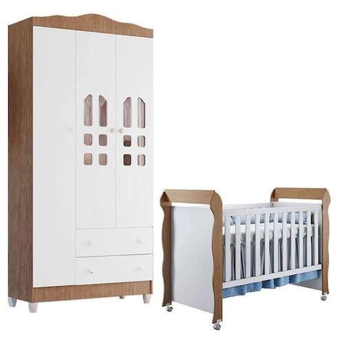 Berço Americano Mirelle e Guarda Roupa New Selena 3 Portas Branco Acetinado Amadeirado Carolina Móveis