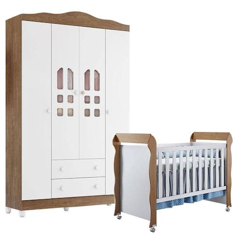 Berço Americano Mirelle e Guarda Roupa New Selena 4 Portas Branco Acetinado Amadeirado Carolina Móveis