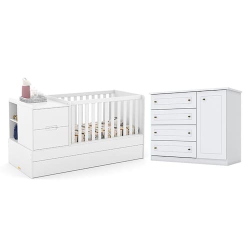 Conjunto infantil composto por Berço Americano Multifuncional Formare Branco Acetinado Matic e Cômoda Infantil Americano Branco HP Henn. O berço multifuncional pode ser utilizado como berço e mini cama, oferecendo praticidade e maior vida útil, além de estrutura resistente e estrado com regulagem de altura. A cômoda conta com ótimo espaço para organização de roupas e acessórios, com design moderno e fácil de combinar. Ideal para um quarto de bebê funcional, seguro e aconchegante.