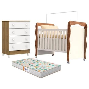 A mamãe está procurando móveis para o quartinho do seu pequeno? Apresentamos para você este belo conjunto composto pelo berço americano da linha New Nanda acompanhado do colchão Gazin e a cômoda gaveteiro da linha Mel Flat. Combina conforto para seu bebê poder descansar e praticidade para a mamãe guardar as roupinhas e acessórios do seu filho. Fabricados pela Carolina, são desenvolvidos em MDP/ MDF de qualidade, prolonga a vida útil dos móveis. Acompanhando todas as fases de crescimento do seu pequeno! Confira as características: