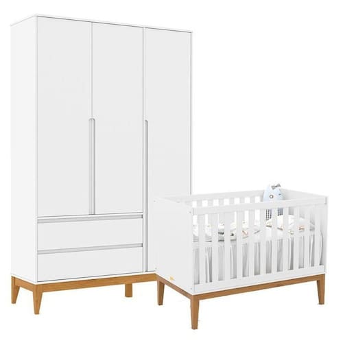 Berço Americano Unique e Guarda Roupa 3 Portas Nature Clean Branco Soft Eco Wood Matic