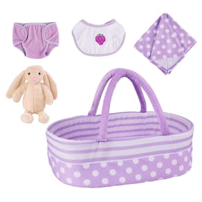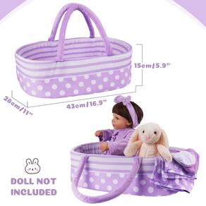 Conjunto de roupas para bonecas roxo -?O pacote inclui?Nosso conjunto de 5 peças de roupas para bonecas renascidas vem com 1* berço roxo, 1* fralda, 1* babador, 1* brinquedo de pelúcia e 1* toalha de um total de 5 acessórios que melhoram a experiência de brincar para crianças. -?TAMANHO DOS ACESSÓRIOS PARA BONECAS?As roupas de boneca renascidas com design estampado de estrelas e chapéu de bebê estão disponíveis em uma variedade de tamanhos para caber em bonecas e bonecas realistas de 17 a 22 polegadas. -?BERÇO DE BONECAS?O berço acessório de roupas para bonecas com design de pontos roxos é fácil de transportar, durável e tem um grande espaço, que pode acomodar bonecas e acessórios de vestuário, facilitando a brincadeira das crianças em qualquer lugar. -?PRESENTE PERFEITO?Nosso conjunto de roupas para bonecas vem em um pacote fofo e acessórios completos para cuidar bem de bonecas de 17 a 22 polegadas e bonecas renascidas, tornando-o um presente ideal para aniversários, feriados ou outras ocasiões especiais. -?MATERIAL DE SEGURANÇA?Tecidos de alta qualidade, textura confortável, as crianças podem brincar com segurança. Ao mesmo tempo, os acessórios para bonecas podem ser lavados na máquina ou diretamente à mão e, em seguida, continuarão em uso. -?ATENÇÃO?A boneca não está incluída no pacote, somente roupas. -?DESENVOLVA A IMAGINAÇÃO INFANTIL?Bom para desenvolver a imaginação e a criatividade das crianças, deixe as crianças começarem seus jogos de vestir.