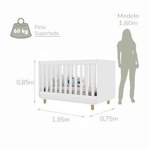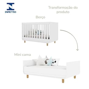 A conversão é prática e pode ser feita em casa. As grades seguem espaçamento regulamentado para máxima proteção. Acabamento: Pintura UV Acabamento dos Pés: Verniz Acompanha Cama Auxiliar: Não Acompanha Móbile: Não Acompanha Suporte para Mosquiteiro: Não Altura: 85 cm Altura do Estrado até o Chão: 54 cm Altura dos Pés: 100 cm Ambiente Principal: Quarto de Bebê Berço 3 em 1: Não Certificado: INMETRO - 001056/2023 codigo_ean: 7900288255778 Complexidade da Montagem: Alta: deve ser montado por um montador especializado Cor: Branco Cor do Produto: Branco Escala de Brilho: Fosco Estilo: Moderno Estrado com Regulagem de Altura: Sim Estrado Regulável em Quantas Posições: 02 Itens Inclusos: 1 Berço, Kit Ferragem e Manual de Montagem Largura: 75 cm Linha ou Coleção: Inmetro Manual de Montagem e Instalação: https://product-hub-prd.madeiramadeira.com.br/707085251/documents/518bc4cc-45ab-4839-8b54-49e2911faff43267737671617600267046953.pdf Marca: Carolina Baby Material da Cabeceira: MDF Material da Grade: MDF Material do Estrado: MDF Material dos Pés: Madeira Maciça Material Principal: MDF Multifunção Flex: Não Necessita Montagem: Sim Opções de Altura do Estrado: 2 Origem do Produto: Nacional Permite a Utilização de Cama Auxiliar: Não Peso: 45 kg Pintura Atóxica: Sim Portátil: Não Possui Capitonê: Não Possui Gavetas: Não Possui Pés: 04 Possui Portas: Não Possui Prateleiras: Não Profundidade: 135 cm Recomendações de Uso, Manutenção e Limpeza: Limpar com pano seco Sapatas Niveladoras: Não Sistema Anti-Refluxo: Não Sistema de Montagem: Parafusos, Cavilhas e Minifix Suporta Até (kg): 60 kg Tamanho do Colchão Indicado (L x C): 70 x 130 cm Tipo de Berço: Berço Mini Cama Tipo de Cabeceira: Lisa Tipo de Estrado: Fixo Tipo de Grade: Fixa Tipo de Madeira Maciça dos Pés: Eucalipto