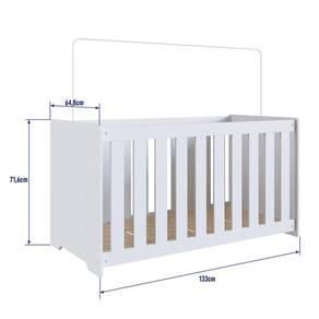 O berço é fabricado em MDP, com revestimento em FF e acabamento fosco, conferindo durabilidade e um visual atraente. Suas dimensões montadas são 133x71,6x64,8 cm, e o peso do produto é de 23,08 kg. O berço suporta um peso máximo de 30 kg e possui registro no INMETRO com o número 000772/2022. A grade do berço é fixa e feita de MDF BP, com um espaçamento entre as barras de 5,5 cm. O estrado é composto por suportes dos lastros em madeira maciça e lastros em MDF, oferecendo estabilidade e resistência. O estrado possui três opções de altura: 1º altura: 9 cm, 2º altura: 23 cm e 3º altura: 38 cm.