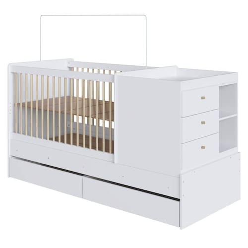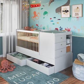 O Berço Cama Multifuncional com Gavetões da Completa Móveis é versátil, prático e elegante. Com características que o destacam e tornam multifuncional, inicialmente pode ser utilizado como berço integrado com cômoda e trocador na parte lateral. Após o passar do tempo, pode ser desmembrado e utilizado como cama de solteiro e cômoda avulsa ou mesa de cabeceira. Com gavetões inferiores possibilitando mais espaço para guardar brinquedos, roupas de cama e até mesmo fraldas! Produzido em MDP e grades em Pinus, trazendo leveza e um toque diferenciado no design. Dimensões:194 x 105,7 x 84,5 cm (Comprimento X Largura X Profundidade) Produto composto por 4 volumesPeso: 97.86 kgSuporta até 30 kg como berçoSuporta até 80 kg como cama de solteiroSuporta até 25 kg nos gavetõesSuporta até 5 kg nas gavetas1 altura do estrado até o chão: 40 cm2 altura do estrado até o chão: 55 cm3 altura do estrado até o chão: 71 cmEspaço entre as grades: 5,5 cmAcompanha suporte para mosquiteiro sem véuNúmero do Registro do Inmetro: 001564/2024 Dimensões Cama de Solteiro:194 x 68 x 84 cm (Comprimento X Largura X Profundidade) Dimensões Gavetões94,6 x 82,6 x 18,8 cm (Comprimento X Largura X Profundidade) Dimensões Cômoda:84,5 x 68 x 61 cm (Comprimento X Largura X Profundidade)Altura dos nichos: 25,2 cm Colchão Indicado para berço (LxPxA): 130x70x12 cmColchão Indicado para cama de solteiro (LxPxA): 188x78x12 cmNão acompanha colchão Garantia de seis meses após a emissão da nota fiscalO produto é entregue desmontado, montagem não inclusaUse um pano levemente umedecido com água, seguido de pano seco. Não utilize produtos químicos ou abrasivos