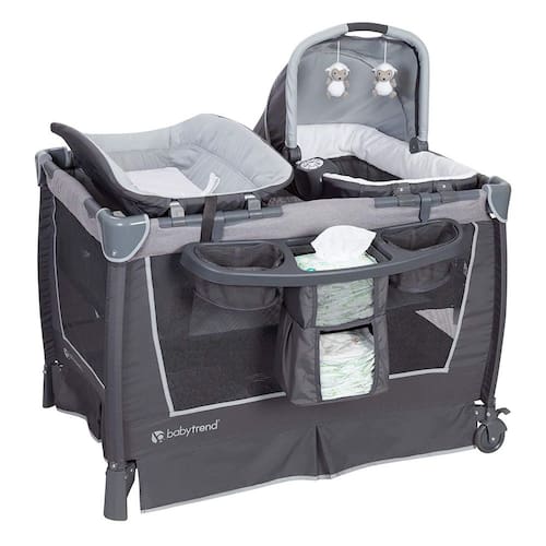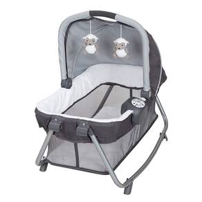 O berço cercado Baby Trend Retreat apresenta um berço Rock A Bye removível com dossel e alça de transporte, tecido de pelúcia e laterais de malha para ventilação adequada e 2 brinquedos.