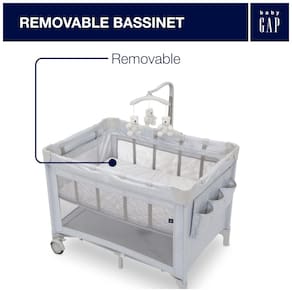 Os logotipos babyGap criam uma aparência elevada. O braço de brinquedo removível com 3 Ursos Brannan de pelúcia envolve o desenvolvimento visual inicial. O zenamento suspenso oferece muito espaço para fraldas, lenços umedecidos e outros produtos de higiene pessoal.