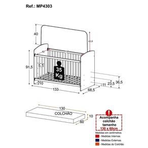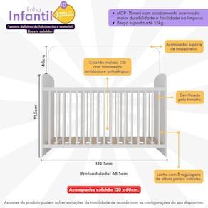 Design e durabilidade: Produzido em MDP com acabamento acetinado (cerca de 20% de brilho), este berço traz um toque de elegância ao ambiente. Com padrão nacional (tamanho do colchão 130x60cm), suporta até 35kg, garantindo conforto e resistência.