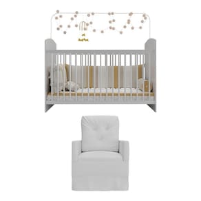 O Berço com Poltrona de Amamentação Ana Lívia Multimóveis MP4069 foi criado para complementar o quartinho, facilitando a vida da mamãe nos preparativos para a chegada do bebê. O berço é padrão nacional (tamanho do colchão 130cm x 60cm), produzido 100% em MDP (suporta 30kg) com acabamento em pintura UV, que garante maior durabilidade e facilidade na limpeza. O lastro possui 3 regulagens de altura para o colchão e acompanha suporte para mosquiteiro, que garante noites mais tranquilas de sono. Berço certificado pelo INMETRO sob o Selo n 001073/2017. NÃO ACOMPANHA COLCHÃO. A poltrona de amamentação é produzida em madeira de eucalipto, com revestimento em material sintético, molas reforçadas e mecanismo de balanço, proporcionando muito aconchego. Capaz de suportar 110kg, o assento possui densidade D23, que garante maior conforto e durabilidade.