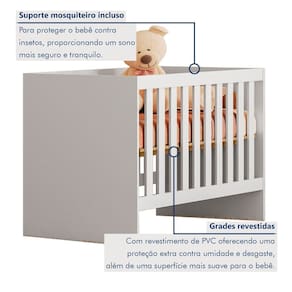 Qual é a vantagem de um berço com suporte para mosquiteiro? Ele protege o bebê de insetos, sem o uso de repelentes ou produtos químicos no quarto.