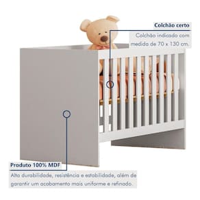 Berço com Regulagem de Altura 100% MDF Soft Americano Branco. Seu bebê merece um cantinho aconchegante e cheio de estilo! Com 3 níveis de altura, nosso berço padrão americano 100% MDF garante mais conforto e segurança em cada fase do seu pequeno, garantindo que seu pequeno aproveite por mais tempo com muito conforto. O design moderno combina com qualquer decoração, deixando o quartinho ainda mais aconchegante. Praticidade para os pais, conforto para o bebê e um toque de fofura extra no ambiente! Qual é a vantagem de um berço com suporte para mosquiteiro? Ele protege o bebê de insetos, sem o uso de repelentes ou produtos químicos no quarto. Vale a pena comprar um berço que vira caminha? Sim! É uma ótima opção para quando o bebê já está mais independente, mas ainda precisa de uma cama segura e de altura baixa.