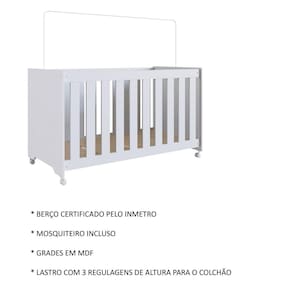O berço acompanha suporte de mosquiteiro, sem véu, proporcionando proteção contra insetos. O colchão indicado para uso é de tamanho 130x60 cm, porém, o colchão não está incluso na compra.