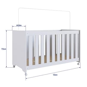 O berço é fabricado em MDP, com revestimento em FF e acabamento fosco, conferindo durabilidade e um visual atraente. Suas dimensões montadas são de 133x77,5x64,8 cm, e o peso do produto é de 23,48 kg. Com capacidade de suportar até 30 kg, o berço oferece segurança e estabilidade.