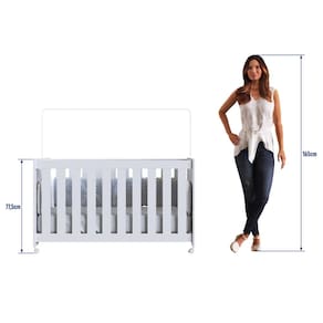 A grade do berço é fixa e feita de MDF BP, com espaçamento entre as barras de 5,5 cm. O estrado é composto por suportes dos lastros em madeira maciça e lastros em MDF, com três opções de regulagem de altura: 1 altura: 15 cm, 2 altura: 29 cm e 3 altura: 44 cm.