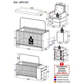 O Berço Cômoda com Colchão, Poltrona de Amamentação e Puff Meu Bebê Multimóveis MP4102 foi criado para complementar o quartinho, facilitando a vida da mamãe nos preparativos para a chegada do bebê. O berço é padrão nacional (tamanho do colchão 130cm x 60cm), produzido em MDP com acabamento acetinado (cerca de 20% de brilho), que garante maior durabilidade e facilidade na limpeza. A cômoda acoplada (não é possível montar separadamente) possui 2 gavetas espaçosas com corrediças metálicas, que proporcionam mais leveza no manuseio e um nicho para deixar o quartinho organizado. O lastro possui 3 regulagens de altura para o colhão e acompanha suporte para mosquiteiro, que garante noites mais tranquilas de sono. Berço Certificado pelo INMETRO sob o Selo n 012251/2022. O Colchão D18 (suporta 50kg), que acompanha o berço, é produzido 100% em tecido poliéster com preenchimento em espuma. Possui tratamento anti-ácaro e anti-alérgico e é indicado para crianças de até 3 anos. A poltrona de amamentação é produzida em madeira de eucalipto, com revestimento em tecido veludo, molas reforçadas e mecanismo de balanço, proporcionando muito aconchego. Capaz de suportar 110kg, o assento possui densidade D23, que garante maior conforto e durabilidade. Já o puff possibilita o descanso das pernas e dos pés tornando esse momento ainda mais confortável.