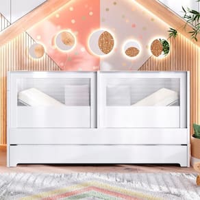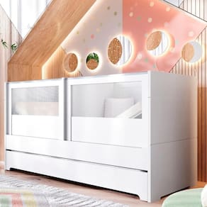 O Berço para Gêmeos Branco Sol e Mar, prático e multifuncional, esse berço ganha todas as mamães de gêmeos que além de estarem próximos na gestação, agora, podem compartilhar o mesmo berç produto conta com uma cama auxiliar que fica embaixo do berço. Além disso o berço de gêmeos é um produto que tem sua vida útil por muito mais tempo, pois após a utilização como berço é possível montá-lo como uma cama de solteiro e continua com a cama auxiliar embutida.