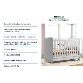 Material de Estrutura - MDF Estilo do Móvel - Clássico Tipo de Pintura - Ultravioleta Tipo de Acabamento da Pintura - Atóxica Tipo de Cama - Cama Infantil Material do Estrado - Estrado de Madeira Tamanho da Cama - Infantil Tamanho de colchão para usar no berço - 70x130 Diferenciais dos Móveis Infantis - Suporte p/ Mosquiteiro - Berço Multiuso - Grade de Segurança - Grades Removíveis