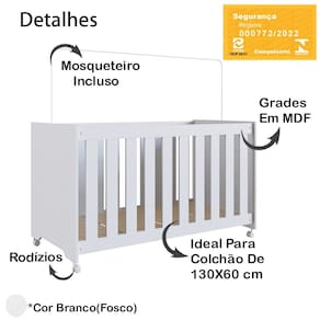 Berço Infantil certificado pelo INMETRO n° 000772/2022, além de ser um produto versátil e multifuncional, conta com um design lindo e sofisticado, deixando o ambiente ainda mais moderno e aconchegante. Estrutura em MDP de 15 mm, feito com material ecologicamente correto, para melhor durabilidade e resistência à peça, e excelente acabamento em Finish Foil (Fosco). Composto por estrado em MDF de 6 mm com altura regulável em três opções: 1ª: 15 cm 2ª: 29 cm e 3ª: 44 cm, travessas em MDF de 15 mm, grades fixas em MDF de 12 mm, com espaço entre elas de 5,5 cm e acabamento em BP, acompanha suporte para mosquiteiro e rodízios plásticos. O colchão indicado é de 130x60 cm (Não Acompanha Colchão). Suporta até 30 kg distribuídos. Este móvel chegará em sua casa separado em 02 volumes.
