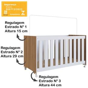 Berço Infantil certificado pelo INMETRO n° 000772/2022, além de ser um produto versátil e multifuncional, conta com um design lindo e sofisticado, deixando o ambiente ainda mais moderno e aconchegante. Estrutura em MDP de 15 mm, feito com material ecologicamente correto, para melhor durabilidade e resistência à peça, e excelente acabamento em Finish Foil (Fosco). Composto por estrado em MDF de 6 mm com altura regulável em três opções: 1ª: 15 cm 2ª: 29 cm e 3ª: 44 cm, travessas em MDF de 15 mm, grades fixas em MDF de 12 mm, com espaço entre elas de 5,5 cm e acabamento em BP, acompanha suporte para mosquiteiro e rodízios plásticos. O colchão indicado é de 130x60 cm (Não Acompanha Colchão). Suporta até 30 kg distribuídos. Este móvel chegará em sua casa separado em 02 volumes.