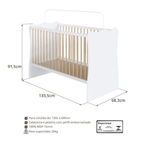 Com design moderno e clean, o Berço Infantil Plasbaby é a escolha perfeita para o quarto dos sonhos do seu bebê! Produzido em MDF/MDP de alta qualidade e com os cantos arredondados ele garante maior segurança e conforto que o seu pequeno precisa para noites tranquilas de sono. Possui armação para mosquiteiro para uma noite se sono tranquila, podendo ser facilmente removido conforme a necessidade. As Grades são fixas, atendendo as rigorosas normas do INMETRO, (Registro 005334/2025) proporcionando a seu filho toda a segurança que ele necessita. Acabamento: Finish Foil Acompanha Cama Auxiliar: Não Acompanha Dossel: Não Acompanha Móbile: Não Acompanha Suporte para Mosquiteiro: Sim - Sem Véu Altura: 91,5 cm Altura do Estrado até o Chão: 44,5 cm Ambiente Principal: Quarto Infantil Certificação Inmetro (Código): 5334 Certificado: INMETRO- 005334/2025 codigo_ean: 7900288223869 Complexidade da Montagem: Baixa: pode ser montado por uma pessoa sozinha Cor: Branco / Natural Cor do Produto: Branco / Natural Cor Flex: Não Escala de Brilho: Fosco Estilo: Moderno Estrado com Regulagem de Altura: Sim Estrado Regulável em Quantas Posições: 02 Itens Inclusos: 1 Berço, Kit Ferragens e Manual de Montagem Largura: 133,5 cm Linha ou Coleção: Plasbaby Manual de Montagem e Instalação: https://product-hub-prd.madeiramadeira.com.br/191784630/documents/92b627f0-af5a-40bb-9885-c97817e9b33e3164470522517563140212187.pdf Marca: Plasmóbile Material da Cabeceira: MDP Material da Grade: mdf e madeira de pinus revestida com polietileno Material do Estrado: MDF Material Principal: MDP Montagem Flex: Não Multifunção Flex: Não Necessita Montagem: Sim Opções de Altura do Estrado: 21,5 ou 43 Origem do Produto: Nacional Permite a Utilização de Cama Auxiliar: Não Peso: 20 kg Pintura Atóxica: Não Portátil: Não Possui Gavetas: Não Possui Pés: Não Possui Portas: Não Possui Prateleiras: Não Profundidade: 68,3 cm Recomendações de Uso, Manutenção e Limpeza: Para a limpeza do móvel utilizar pano levemente umedecido Sistema Anti-Refluxo: Não Sistema de Montagem: Parafusos Suporta Até (kg): 35 kg Tamanho do Colchão Indicado (L x C): 130x60cm Tipo de Berço: Berço Padrão Nacional Tipo de Cabeceira: Lisa Tipo de Estrado: Fixo Tipo de Grade: Fixa Marca: Não Informado