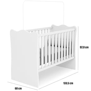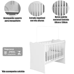O Berço Docinho foi projetado especialmente para oferecer conforto e segurança ao bebê. Com um design clássico e delicado, ele garante beleza e aconchego para o ambiente. O berço acompanha suporte para mosquiteiro, que proporciona noites mais tranquilas e seguras. O berço infantil possui certificação compulsória de acordo com as portarias do Inmetro. O berço infantil é feito em MDP de 15 mm, pintura atóxica e livre de materiais pesados, grades fixas feitas em MDF de 12mm e 25mm, para total segurança do bebê, estrado regulável em três alturas que possibilita que conforme o crescimento do bebê, mais profundo fica o berço. Bordas arredondadas para evitar riscos de acidentes e medida ideal para colchão de 60cm x 130cm.