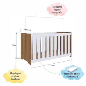 Marca: Completa Móveis | Modelo: Berço Simples com Regulagem | Material: MDP | Acabamento: Fosco | Cor: Nogal Manchester com Branco | Largura (cm): 133 | Altura (cm): 71,6 | Profundidade (cm): | Peso do Produto (Kg): 26,70 | Quantidade de Volume: 2 | Peso Suportado (Kg): 30 | do Certificado Registro do Inmetro: 000772/2022 | Tipo de Grade: Fixa | Material da Grade: MDF | Espaço entre Barras da Grade (cm.): 5,5 | Material do Estrado: Suportes dos lastros em madeira maciça e lastros em MDF | Quantidade de Regulagem do Estrado: 3 | Opções de Altura do Estrado (cm): 1 altura: 38; 2 altura: 23; 3 altura: 9 | Acompanha Suporte de Mosquiteiro: Sim, sem véu | Colchão Indicado (LxPxA) (cm): 130x60x10 | Acompanha Colchão: Sim | Possui Gaveta: Não | Possui Rodízios: Não | Material dos Pés: MDP | Necessita Montagem: Sim | Nível de Dificuldade da Montagem: Médio | Sistema de Montagem: Sistema de montagem via parafusos, cavilhas e sistema minifix | Idade Recomendada (meses): 0 à 24 | Idade Mínima Recomendada (anos): 0 | Idade Máxima Recomendada (anos): 3 | Quantidade de Item: 1 | Duração da Garantia: 6 Meses | País de Origem: | Tipo de Garantia: Garantia do Fabricante | Dimensão (AxLxC) cm: 71,6x64,8x133 | Inclui Manual de Montagem: Sim