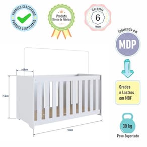 Marca: Completa Móveis | Modelo: Berço Simples com Regulagem | Material: MDP | Acabamento: Fosco | Cor: Branco | Largura (cm): 133 | Altura (cm): 71,6 | Profundidade (cm): | Peso do Produto (Kg): 25,70 | Quantidade de Volume: 1 | Peso Suportado (Kg): 30 | do Certificado Registro do Inmetro: 000772/2022 | Tipo de Grade: Fixa | Material da Grade: MDF | Espaço entre Barras da Grade (cm.): 5,5 | Material do Estrado: Suportes dos lastros em madeira maciça e lastros em MDF | Quantidade de Regulagem do Estrado: 3 | Opções de Altura do Estrado (cm): 1 altura: 38; 2 altura: 23; 3 altura: 9 | Acompanha Suporte de Mosquiteiro: Sim, sem véu | Colchão Indicado (LxPxA) (cm): 130x60x10 | Acompanha Colchão: Não | Possui Gaveta: Não | Possui Rodízios: Não | Material dos Pés: MDP | Necessita Montagem: Sim | Nível de Dificuldade da Montagem: Médio | Sistema de Montagem: Sistema de montagem via parafusos, cavilhas e sistema minifix | Idade Recomendada (meses): 0 à 24 | Idade Mínima Recomendada (anos): 0 | Idade Máxima Recomendada (anos): 3 | Quantidade de Item: 1 | Duração da Garantia: 6 Meses | País de Origem: | Tipo de Garantia: Garantia do Fabricante | Dimensão (AxLxC) cm: 71,6x64,8x133 | Inclui Manual de Montagem: Sim