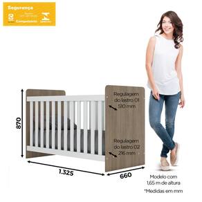 FICHA TÉCNICA BERÇO: Nº Registro INMETRO Berço: 001 087/2020. Multifunção Flex: Não Acompanha Móbile: Não Acompanha Suporte para Mosquiteiro: Sim Espaço Entre as Barras das Grades: 5,8 Cm Entre os Palitos das Grades Material da Grade: MDF Tipo de Grade: Fixo Material do Estrado: MDF 6 mm Estrado Regulável em Quantas Posições: 2 Posições: Regulagem Alta: 56,4 Cm da parte de cima do Lastro até o chão. Regulagem Baixa: 29 Cm da parte de cima do Lastro até o chão. Produto Suporta até: 25 Kg Sistema Anti-Refluxo: Não Pintura Atóxica: Sim Possui Pés: 0, Possui Rodapé Possui Rodízio: Não Possui Material dos Pés: MDP Acabamento: Na versão Rústico a Pintura é UV Texturizada e na versão Branco a Pintura é UV Escala de Brilho: Na versão Rústico é Fosco e na versão Branco é Brilho Material Principal: MDP Qtd. Gavetas: Não possui Acompanha Colchão: Não Tamanho Colchão Indicado: Para colchão de 1,30 x 0,60 m Material do Fundo: MDP