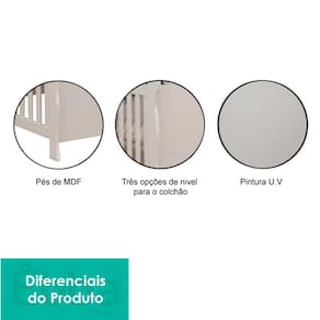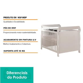 Berço em MDF/MDP, com Cabeceiras fabricadas em material de alta resistencia mecanica, com superficies e bordas lisas e arredondadas, estrado em madeira maciça, com duas alturas de regulagem, acabamento por camada de verniz fotocurado de composiçao nao tóxica, padrao americano, acompanha suporte mosquiteiro,