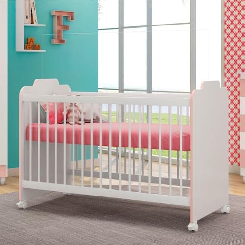 O berço contém Pintura em alto brilho, Kit rodízios 40mm e 02 regulagens de altura.