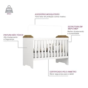 Versatilidade e funcionalidade O Berço Mini Cama Carolina Baby Mel 3 em 1 é uma opção completa e prática para acompanhar o crescimento do seu bebê. Com 133 cm de largura e um design tradicional, ele é confeccionado em 100% MDF, garantindo durabilidade e resistência. O berço é pintado com acabamento laqueado branco fosco e possui grades em madeira revestida de PVC, com pintura UV atóxica, proporcionando segurança e facilidade de limpeza. O modelo é padrão americano e conta com um suporte para mosquiteiro, oferecendo conforto e proteção para o bebê durante o sono.