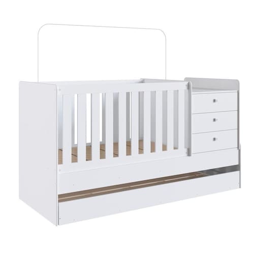 A da Completa Móveis é o berço BB690, de qualidade incrível graças á estrutura em MDP e acabamento em pintura BP, agregando resistência e prolongando a vida útil do produto. Mas o detalhe principal desse berço multifuncional é sua praticidade, já que ele possui suporte para mosquiteiro, estrado com 2 regulagens de altura, grade móvel, cômoda com 3 gavetas e trocador na lateral. Ou seja, tudo que o quarto do bebê precisa para oferecer o melhor!