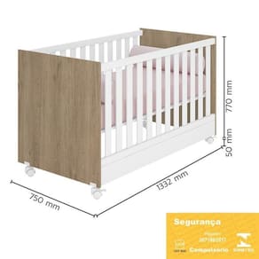 Berço Mini Cama Doce Sonho Carvalho/branco Com Rodízios - Qmovi Carvalho/branco Berço Mini Cama Doce Sonho com Rodízios - Qmovi O Berço Doce Sonho foi projetado especialmente para oferecer conforto e ao bebê. Com um design clássico e delicado, ele garante beleza e aconchego para o ambiente. Ele acompanha o desenvolvimento do seu filho se transformando em uma linda mini cama. O berço possui certificado do INMETRO, o que proporciona noites mais tranquilas e seguras. Uma escolha de amor e cuidado com o seu bebê. ESPECIFICAÇÕES: - Estrutura em MDP - Pintura UV atóxica - Padrão americano - Grades fixas - Estrado e travessas em MDF - Estrado regulado em 3 alturas: 1- 35cm, 2- 48cm, 3- 61cm - Acompanha suporte para mosquiteiro - Se transforma em mini cama - Certificado compulsório do INMETRO 007189/2017 - 4 Rodízios, sendo 2 com trava - Colchão recomendado 70x130cm - Não acompanha colchão