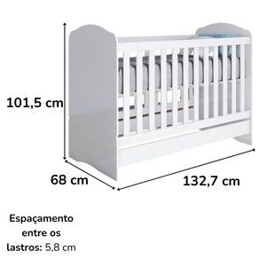 O berço possui cabeceiras em MDP (12 mm) com moldura (15 mm), grades fixas em MDF (06 mm), estrado em MDF (25 mm) e suporte para mosquiteiro. Design 3 em 1, transformando-se em berço-cama e mini-cama, com 2 regulagens de altura (29 cm e 56,4 cm do chão). Indicado para colchão 130 x 60 cm.