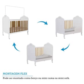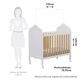 Características: 4 Rodízios sendo 2 com trava Acabamento em pintura UV atóxica Acompanha suporte para mosquiteiro Berço 3 em 1 Certificado INMETRO 000993/2017 Estrutura 100 em MDF Estrutura 12mm, Moldura e Barra das Grades 25mm Não acompanha colchão Produto Flex: Pode montar como berço, mini cama ou mini sofá Suporta até 40kg Tamanho do colchão indicado 70 cm x 130 cm Tipo de estrado regulável em 3 posições -30,9cm, 46,90cm e 59,70cm-