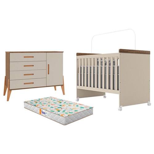 Berço Mini Cama Lívia e Cômoda com Porta Emilly Off White Carvalho com Colchão Gazin - Canaã