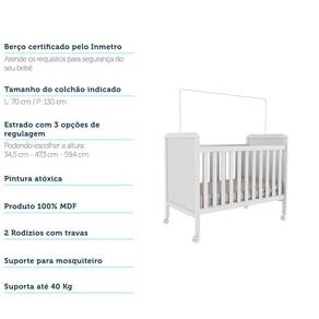 O Berço Mini Cama Cloe da Móveis Peroba é uma ótima opção para proporcionar conforto e elegância para o quarto do seu bebê! Produzido 100% em MDF, garantindo estabilidade e segurança, sendo a melhor opção para que seu baby descanse. Bem prático, o berço transforma-se em uma minicama, adaptando-se ao crescimento da criança. Este berço é lindo e funcional e vai satisfazer toda família. O berço possui acabamento em pintura não atóxica, pensando no bem estar dos usuários. Que demais né!? Garanta já o seu!