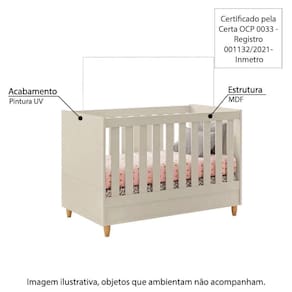 Características - Off White - Estrutura: MDF - Acabamento: Pintura UV - Berço vira mini cama - Grades de 25mm e 9mm - Estrado com 2 regulagens de altura - 1 Mosquiteiro aramado - Para colchão padrão americano de 70x130 cm(não incluso) - 4 Pés reforçados em madeira - Certificado pela Certa OCP 0033 - Registro 001132/2021 - Inmetro - Peso suportado: 25 kg - Móvel entregue desmontado, montagem não inclusa - Marca: Móveis Estrela