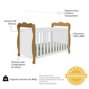 Ofereça um ambiente seguro e aconchegante para o bebê! Acabamento: Pintura UV Acabamento dos Pés: Pintura Acompanha Cama Auxiliar: Não Acompanha Dossel: Não Acompanha Móbile: Não Acompanha Suporte para Mosquiteiro: Sim - Sem Véu Altura: 99 cm Altura do Estrado até o Chão: 25 cm Altura dos Pés: 7,8 cm Ambiente Principal: Quarto de Bebê Berço 3 em 1: Sim Certificado: INMETRO 013208/2022 codigo_ean: 7900288068842 Complexidade da Montagem: Média: pode ser montado por mais de uma pessoa e/ou necessite de maior conhecimento para montagem Cor: Branco/Amêndoa Cor do Produto: Branco/Amêndoa Escala de Brilho: Brilhante Estilo: Provençal Estrado com Regulagem de Altura: Sim Estrado Regulável em Quantas Posições: 02 Informações Complementares: Escala de Brilho: Branco Brilhante e Amêndoa Semibrilho. Itens Inclusos: 1 Berço + Kit Ferragens + Manual de Montagem Largura: 148 cm Linha ou Coleção: Alice Manual de Montagem e Instalação: https://cdn2.madeiramadeira.com.br/atributo/moveis-peroba/2692075-2819-17397983253903.pdf Marca: Espresso Móveis Material da Cabeceira: MDF Material da Grade: MDF 25mm e 12 mm Material do Estrado: MDF e laminado de madeira Material dos Pés: MDF Material Principal: MDF Montagem Flex: Sim, pode ser montado como Berço, ou Minicama ou Minisofá. Multifunção Flex: Não Necessita Montagem: Sim Opções de Altura do Estrado: 16,30cm e 45,10cm Origem do Produto: Nacional Permite a Utilização de Cama Auxiliar: Não Peso: 32,40 kg Pintura Atóxica: Sim Portátil: Não Possui Capitonê: Não Possui Gavetas: Não Possui Pés: 04 Possui Portas: Não Possui Prateleiras: Não Profundidade: 78,4 cm Recomendações de Uso, Manutenção e Limpeza: Para limpeza utilizar somente pano limpo e macio, ligeiramente umedecido em água (apenas o bastante para remover a poeira), seguido de um pano seco. Sapatas Niveladoras: Sim Sistema Anti-Refluxo: Não Sistema de Montagem: Parafusos autoatarraxantes, parafusos rosca métrica, porcas metálicas, sistema minifix, cavilhas de madeira, chapas metálicas, acessórios plásticos. Suporta Até (kg): 40 kg Tamanho do Colchão Indicado (L x C): 70cm x 130cm Tipo de Berço: Berço Mini Cama Tipo de Cabeceira: Lisa Tipo de Estrado: Removível Tipo de Grade: Fixa